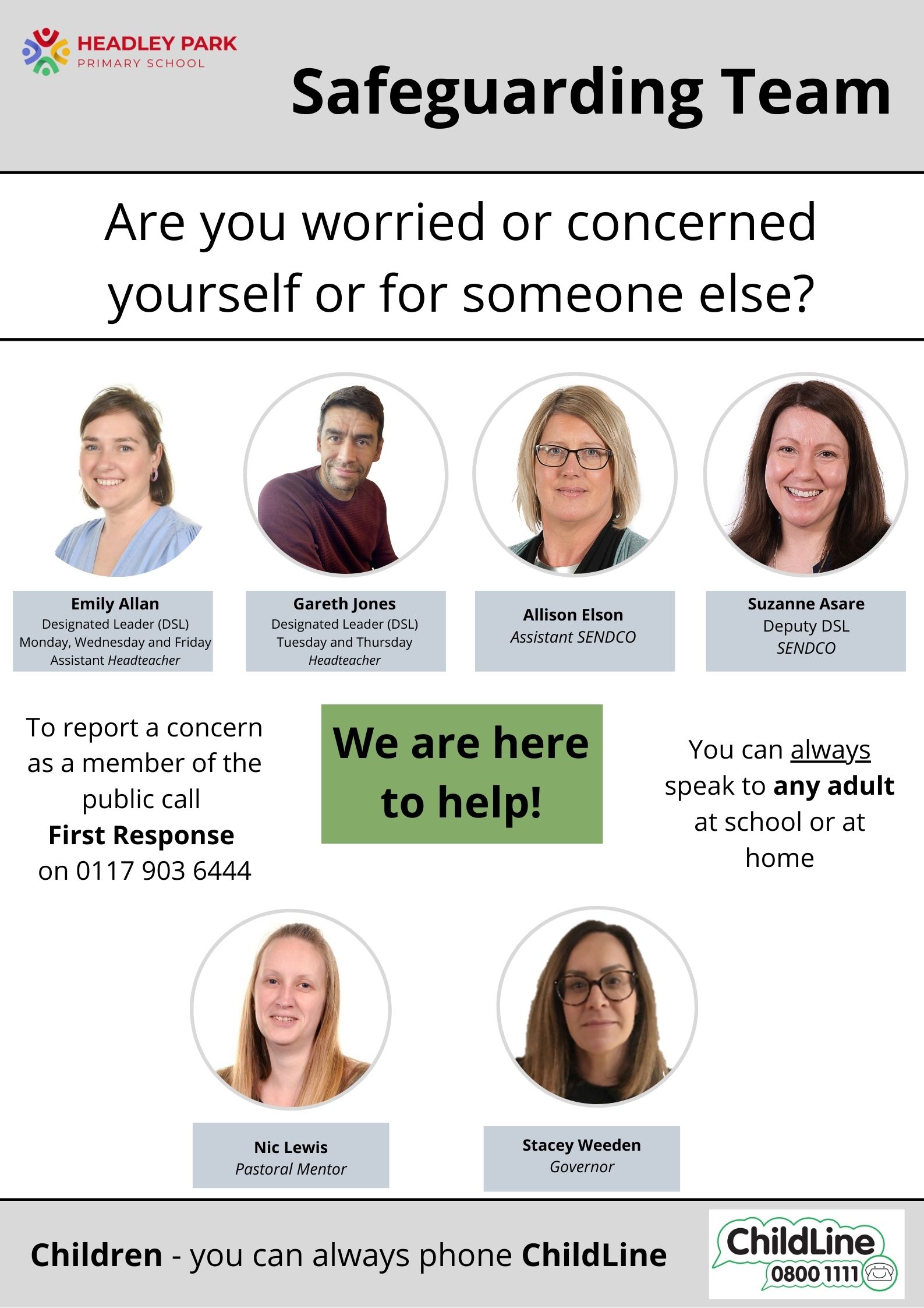 At Headley Park Primary School we believe safeguarding is everybody’s responsibility. We are committed to providing a safe and secure environment for children, staff and visitors and promoting a climate where children and adults have the knowledge and confidence to share and challenge any concerns which they may have about their own safety or the well-being of others.